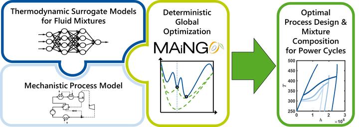 Numerical optimization is very useful for design and operation of energy processes. As the design has a major impact on the economics of the system, it is desirable to find a global optimum in the presence of local optima. So far, deterministic global optimization with detailed thermodynamic models incorporated has been limited to single fluid energy systems. We extend our previously presented approach [Schweidtmann et int Mitsos, COMPUT CHEM ENG (2019)] from single-species working fluids to binary mixtures with variable composition. First, we create accurate thermodynamic data for two selected binary mixtures using a thermodynamic library. Using this data, we train artificial neural networks, select them based on desired accuracy, and include them in the process model. The resulting hybrid model is then optimized with the open-source solver MAiNGO. We perform thermodynamic optimizations of geothermal power plants, considering both organic Rankine and Kalina cycle. For each cycle, we identify the globally optimal design, operation, and working fluid composition for the selected binary fluid mixtures within tractable CPU times. We show how a second mixture component enables improved ORC performance.